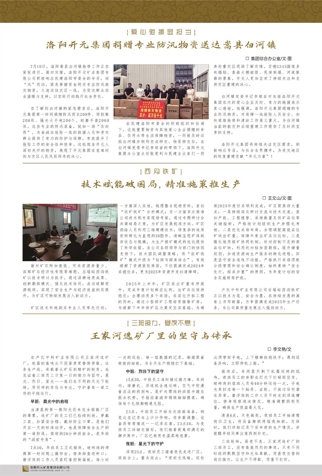 洛陽開元礦業(yè)集團有限公司簡介洛陽開元礦業(yè)集團有限公司,始成立于2006年,位于洛陽市開元大道269號。集團旗下共有十余家全資子公司,業(yè)務(wù)涉及有色金屬礦山開發(fā)、礦產(chǎn)品購銷與進出口貿(mào)易、房地產(chǎn)開發(fā)、文化藝術(shù)、企業(yè)管理與咨詢、資本投資等多個領(lǐng)域。2024年,集團公司銷售總額達7.8億元。民建河南省委委員、民建河南省委企業(yè)委副主任、民建洛陽市委委員、企業(yè)委主任、洛陽民建企業(yè)家協(xié)會會長許明月是公司創(chuàng)始人,現(xiàn)任洛陽開元礦業(yè)集團有限公司董事長。在礦業(yè)領(lǐng)域,洛陽開元礦業(yè)集團擁有多家實力雄厚的子公司:貴州開元礦業(yè)有限公司探、采礦權(quán)面積共11.33平方公里;興海縣銅鑫礦業(yè)有限公司探礦權(quán)面積8.76平方公里,礦山資源潛力巨大;2021年,開元集團與盧氏中科礦業(yè)有限公司開展戰(zhàn)略合作。盧氏中科礦業(yè)有限公司專注于有色金屬的浮選、加工和銷售,擁有強大的技術(shù)支撐平臺,是集探、采、選、冶、研為一體的中大型綜合礦業(yè)企業(yè)。目前,盧氏中科王家河1000噸選礦廠已成功投產(chǎn),雙河金礦、柳關(guān)欒盧鉛鋅礦相繼順利開工,樓房銀礦與圪老灣鉛鋅礦的深部探礦重大突破,標(biāo)志著礦山版圖取得重大進展,為開元集團后續(xù)發(fā)展奠定了堅實基礎(chǔ)。在文化傳媒領(lǐng)域,洛陽市明月美術(shù)館通過豐富多樣的藝術(shù)展覽、學(xué)術(shù)研討和公共教育活動,努力打造一個集展覽、交流、教育、研究為一體的綜合性藝術(shù)平臺。此外,在金融投資領(lǐng)域,開元集團旗下的北京明峰資本管理有限公司專注于投資具有高增長潛力的優(yōu)秀企業(yè),特別是高科技、新能源、環(huán)保等新興產(chǎn)業(yè),為客戶提供個性化的資產(chǎn)配置服務(wù)。在做好企業(yè)經(jīng)營的同時,開元集團始終不忘企業(yè)的社會責(zé)任和家國情懷,以突出的愛心公益事跡,開展了一系列公益慈善活動:“民建林”公益事業(yè)通過“思源基金”“幫幫公益”線上公益平臺,與眾多愛心人士籌措資金20余萬元;資助541名貧困大學(xué)生共計270余萬元,推進“數(shù)字助力——河南AI人才培養(yǎng)”;捐款10萬元,馳援京津冀、黑龍江洪水地質(zhì)災(zāi)害……公司于2017年底被洛陽市慈善總會評為“洛陽慈善風(fēng)云榜——十大愛心集體”。洛陽開元礦業(yè)集團有限公司秉承持續(xù)發(fā)展理念,憑借多年來良好的企業(yè)信譽與經(jīng)營業(yè)績,與全國多家企業(yè)建立了良好合作關(guān)系,受到社會各界的一致好評,多次榮獲“納稅標(biāo)兵”“先進企業(yè)”“招商引資模范企業(yè)”等榮譽稱號?;赝麃頃r路,開元人勠力同心,以“闖”的精神和“創(chuàng)”的勁頭,一路披荊斬棘,踏過千山萬水;展望新未來,開元人凝心聚力,不執(zhí)于“舊”,無畏于“新”,秉承“勇于跨越,追求卓越”的企業(yè)精神,乘著國家高質(zhì)量發(fā)展新征程的東風(fēng),跨過高山,越過大海,向著集團多元化、國際化的目標(biāo),逐夢遠航,跨越前行!